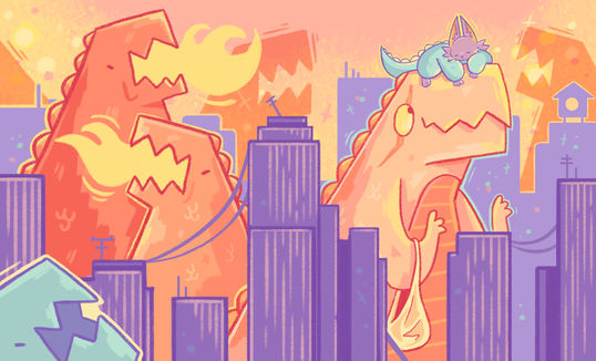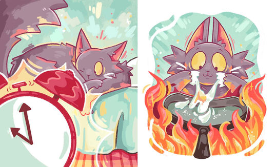 Spilt Milk is a 32 page wordless book about a cat living in a world of monsters. One day while making breakfast the cat notices they are out of milk. To make their breakfast complete the cat must go outside. However in an unlikely event the cat slips revealing they were not a monster but a cat?! In fear the cat ends up meeting an unlikely friendship.
